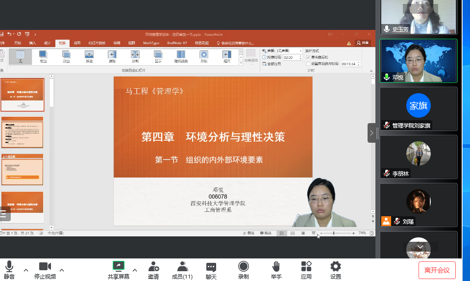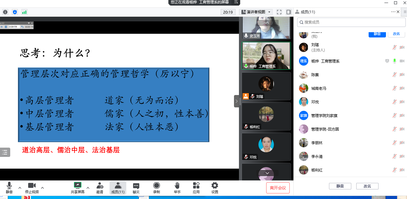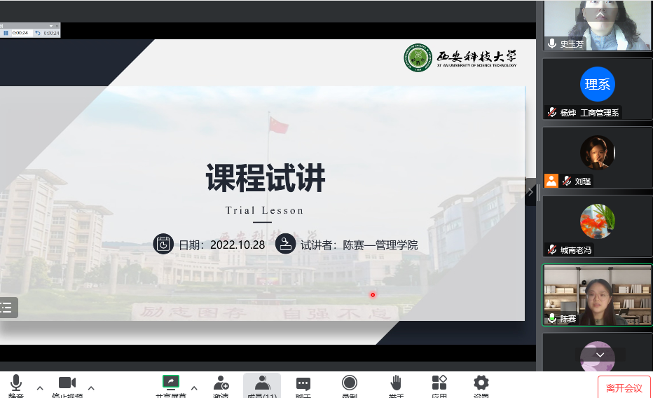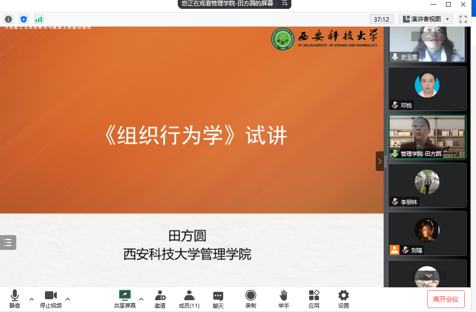 试讲教师线上教学演示15分钟,每位新教工都展现了崭新的教学风貌——自然大方的仪态、丰富的课堂设计、精心制作的多媒体课件等。新教工试讲结束后,几位评委从共性问题、个人存在的问题作了认真的点评,并提出了老教师对新教师的建议和希望:一要注意授课的完整性;二是注意知识的准确性、上课对象,在教学内容中加入课程思政;三语言表达要干净,注意语言节奏,不要过多使用口头禅。