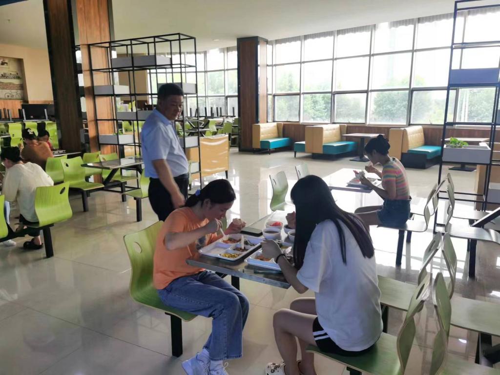 在秦汉校园食堂,来兴平与留校员工共进晚餐,与用餐员工进行交流,了解了同学们暑期的生活状况。
