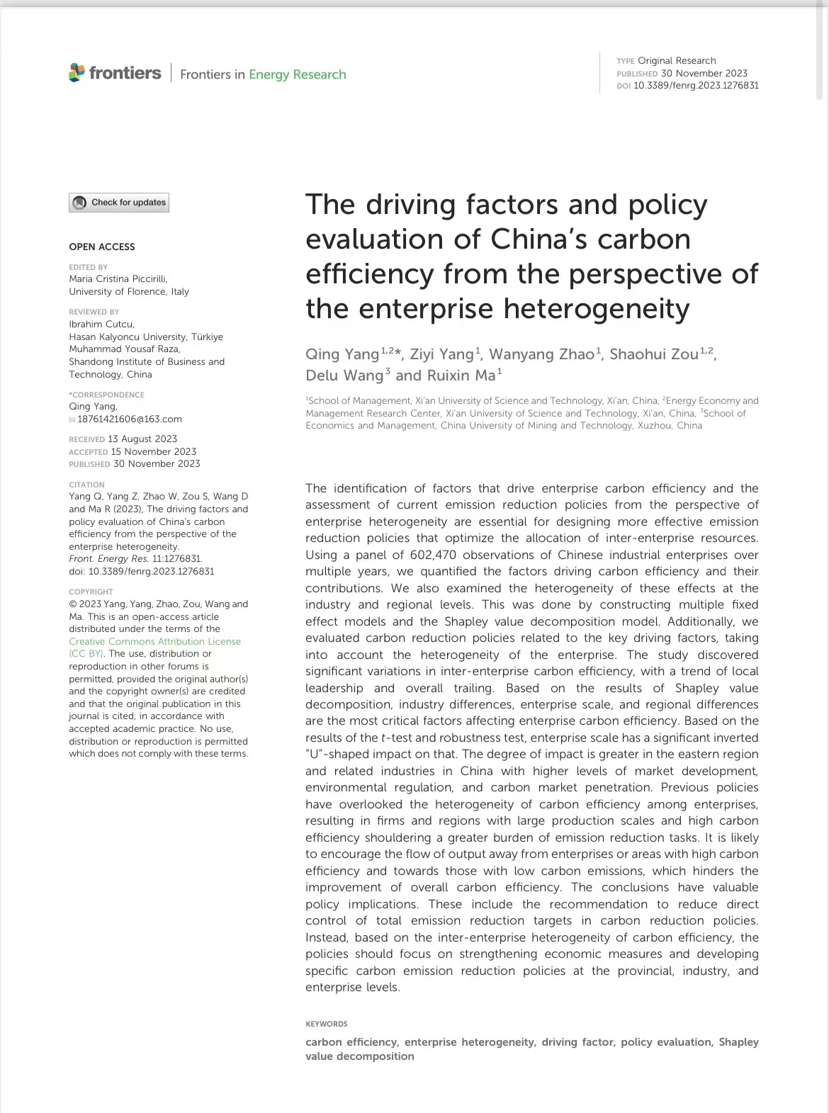 2023年11月30日,银河集团官网老师邹绍辉、杨晴,老师王德鲁,硕士杨紫怡,物流管理专业20级员工赵婉洋和物流管理21级员工马瑞鑫在《能源研究前沿》(《Frontiers in Energy Research》)期刊(影响因子:3.4;JCR分区:Q3;中科院分区:大类学科:工程技术4区,小类学科:能源与燃料4区;学科与分区:ENERGY & FUELS - SCIE(Q3))发表论文《从企业异质性的角度对中国碳效率的驱动因素和政策评估》(The driving factors and policy evaluation of China’s carbon efficiency from the perspective of the enterprise heterogeneity)。