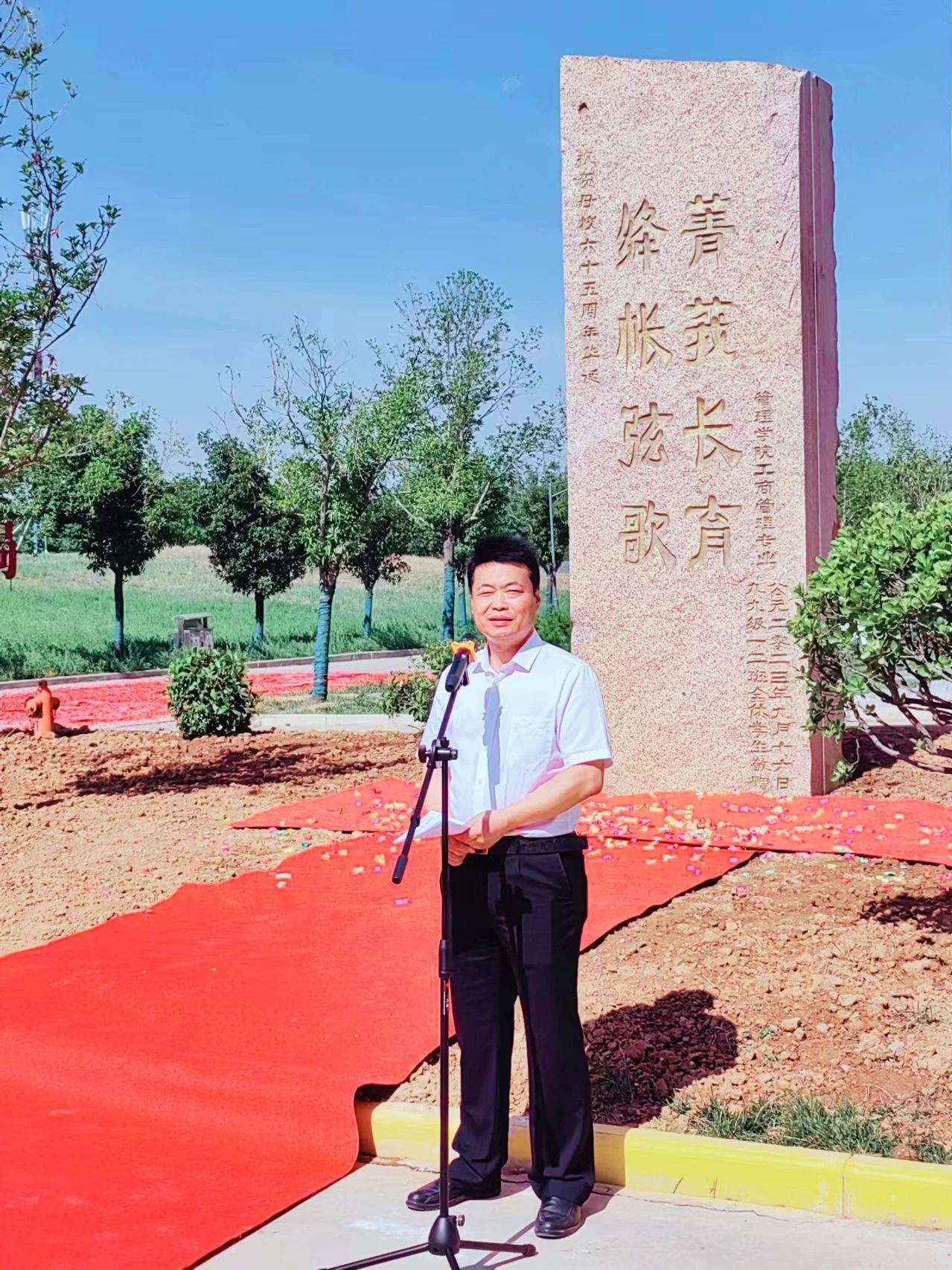 仪式上,工商管理专业99级1-2班员工郭胜介绍了这块来自内蒙古阿拉善、重达十六余吨的景观石的捐赠由来,解读了刻在景观石上的“绛帐弦歌 菁莪长育”的相关典故和深刻内涵。