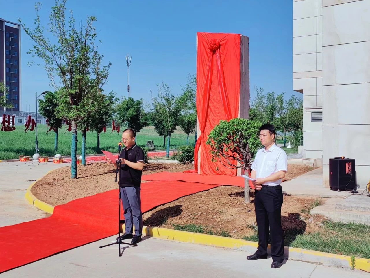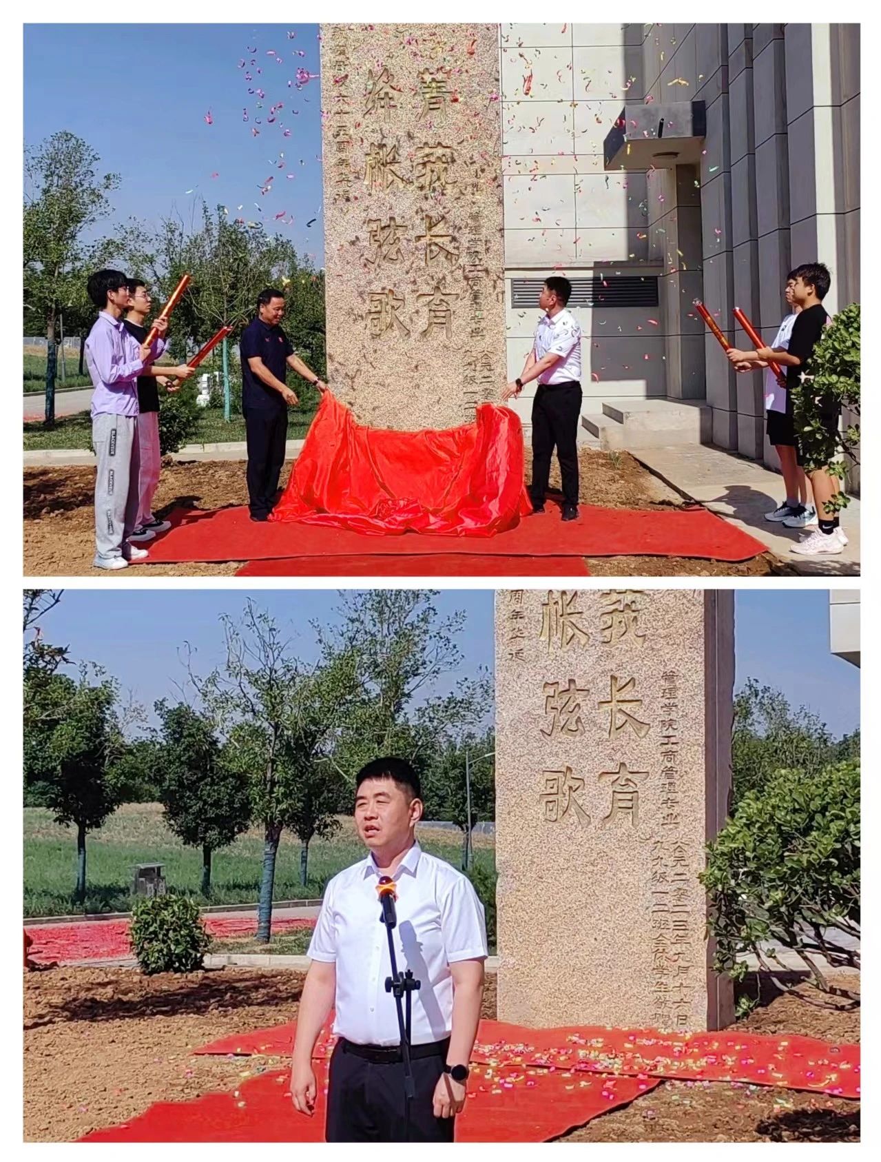 公司党委副书记陈春林和工商管理专业99级1-2班员工、陕建产投集团副总经理、陕西建工新型建材公司董事长佀伟共同为“绛帐弦歌 菁莪长育”景观石揭幕,佀伟还代表工商管理专业99级1-2两个班员工作了发言,他表示员工们对母校一直都非常关心关注,感恩母校对员工们的培养和对员工们工作和事业的支持。