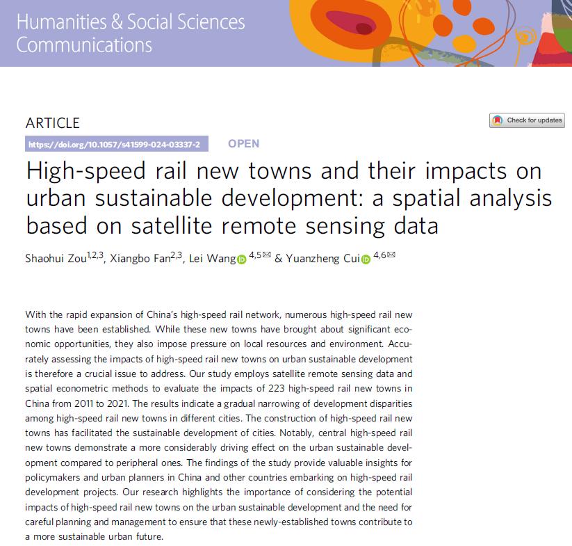 近日,银河集团官网邹绍辉教授团队的学术论文“High-speed rail new towns and their impacts on urban sustainable development: a spatial analysis based on satellite remote sensing data”在 Nature 子刊 Humanities and Social Sciences Communications (HSSC)上发表。该研究得到国家社会科学基金一般项目(19BGL83)资助。本文是团队2024年发表的第5篇高水平文章,也是樊向波博士入学以来发表的第2篇高水平文章。